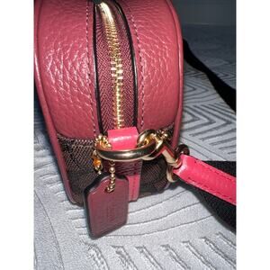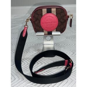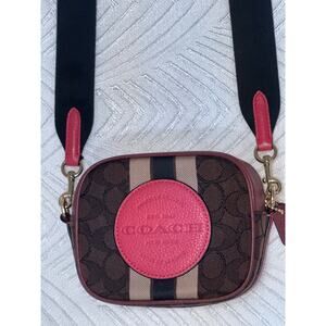 Chic and versatile Coach Mini Dempsey Camera Bag in signature jacquard with bold stripe and leather Coach patch. Features an adjustable/detachable crossbody strap, goldtone hardware, top zip closure, and two interior card slots.