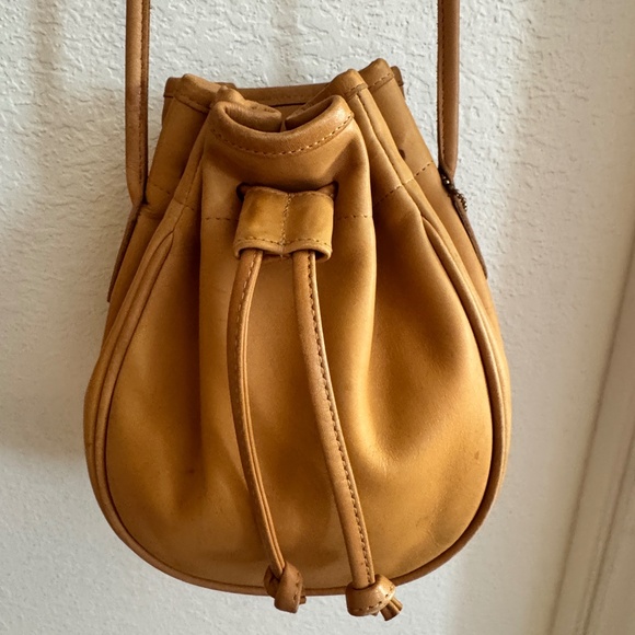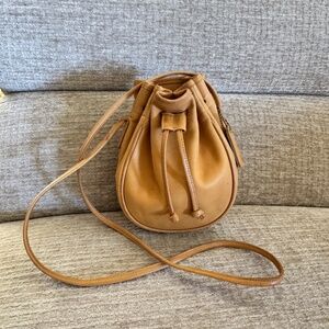 This little honey of a bag is giving all the vintage vibes β a sweet caramel-tan leather drawstring bucket bag with a crossbody strap that's ready to go everywhere you are.