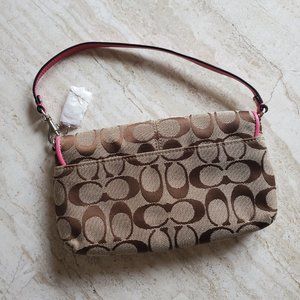 Genuine Coach mini purse with the C logo on it. The purse is tan and has pink trim. The purse is in excellent condition. This is a preowned purse but was only used 1-2x. The keychain on the purse is still wrapped in original packaging. The inside of the purse is tan color and is very clean. There are slots to put credit cards and money, plus more space for personal belongings. This is coming from a smoke free home. This is a Coach signature bag with the classic C logo all over it.