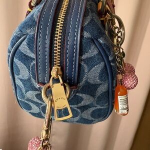 Chic Coach handbag in navy with tan handles. Adorned with a pink heart charm and playful keychains.