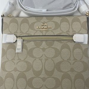 Coach Mini Rowan File Bag In Signature Canvas It's simple and elegant Signature coated canvas and smooth leather Inside multifunction pocket Zip-top closure, fabric lining Outside zip pocket Adjustable strap with 22" drop for shoulder or crossbody wear COLOR: Gold/Light Khaki Chalk 8 1/4" (L) x 8 1/4" (H) x 1 1/4" (W) Style No. CF340