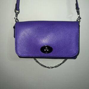 Flawless The Coach Mini Ruby Cross Body Cross Grain Leather Bag in Purple Iris is a small and stylish messenger and cross body bag for casual occasions .Made of purple leather with silver hardware, it features a turn lock closure and a purple and silver chain handle/strap. The bag has a logo accent, fabric lining in purple, and comes with a detachable strap for versatility. Measuring 9 inches in length, 6 inches in height, and 1.5 inches in depth, this Coach bag is designed for everyday use and priced at $295.