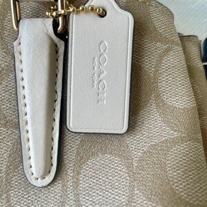 Coach Mini Sage Crossbody bag in cream/khaki - gently used. No scratches on gold hardware. Looks brand new. Tags, care cards are included. It has a very small wear mark near the zip opening (marked with a red arrow in the image). Overall in an excellent condition.