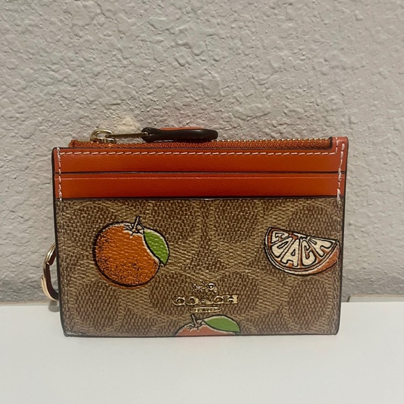 Coach Mini Skinny Id Case With Orange Print (Tan/Signature Canvas)