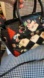 Stylish Coach satchel with floral patchwork. Black base with vibrant multicolor accents. Perfect for any occasion.