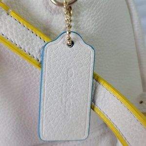This stylish Coach backpack features a turn lock closure and mini size, perfect for on-the-go fashion. The white leather exterior is accented with a colorblock edge, providing a unique and trendy look. The backpack is made with high-quality leather, ready to be a statement piece in any wardrobe.
