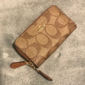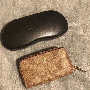 Beautiful mini Coach wallet in perfect condition. It has two zip pockets that can hold tons of credit cards and some cash. I included a picture next to a Ray Bans glasses cases for a size reference.