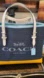 Chic Coach tote with denim blue and mustard yellow accents. Ideal for daily wear. Elegant and practical design.