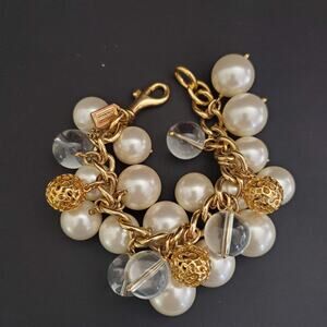 Coach Miranda bracelet has faux pearls with clear baubles and gold signature C balls on a gold tone chain. 6 1/2 inches around inside with a strong clasp. Very good condition. Retails for $248