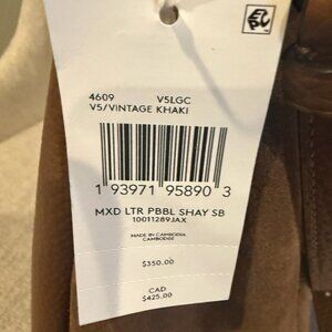 Gorgeous Coach Mixed Leather Pebble Shay Shoulder Bag in the color Vintage Khaki. 100% authentic — retail tag and Coach dust bag included. This is a full-price retail model (not outlet), made with luxurious pebbled leather and soft suede side panels.