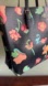 Floral prints on Midnight Navy Blue double faced leather with pink inside . Red middle zip top compartment with cloth fabric lining inside and one open pocket.