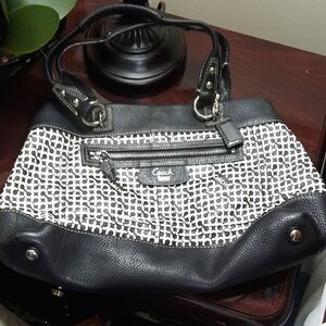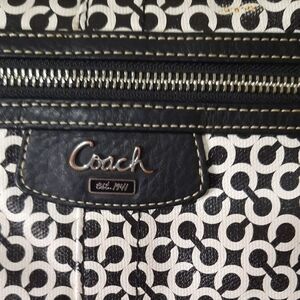 Coach Penelope OpArt black and white Signature bag No. 13532. Features dual handles and front zip pocket.