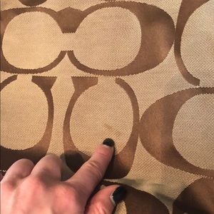 Coach Monogram Hobo style with magenta satin lining. This purse shows a lot of wear, reflected in the price. There are holes and stains in the canvas. Gold hardware and strap in good condition.