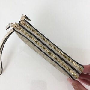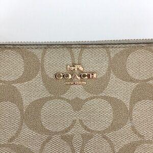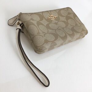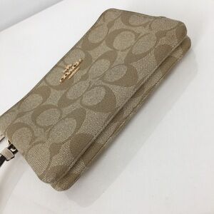 Coach Monogram Wristlet Cream Tan Coated Canvas Gold Tone Hardware Double Zip