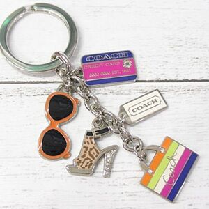 Coach keychain with vibrant charms. Includes sunglasses, shoe, and credit card designs. Crystal accents throughout. Silver tone. LIKE NEW