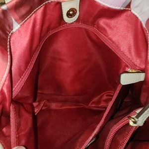 This Coach purse is beautiful! It is medium sized and has 3 compartments for organization. There is smaller straps and a long strap for crossbody or shoulder, that can be removed. As you can see in the last photo in the small zipper pocket there is some glitter and a few spots from some lip stick. You can not tell unless you pull the material all the way out.