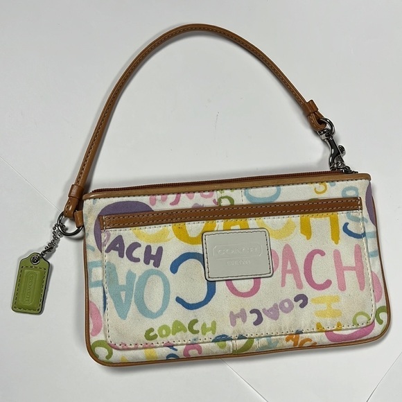 This is a beautiful pre owned Coach Multi Graffiti F42621 Beach Large Flat Wristlet. Satin like canvas with brown leather trim. 7.75” x 4.25” with a 5” handle drop. From almost full size slip in pocket with leather logo shank. Original green and white logo fob. Beige interior with a large separation compartment. Minor scuffs. No stains. No odors. Can be worn as a wristlet or clutch