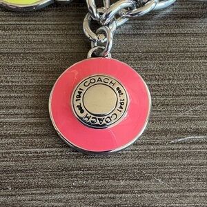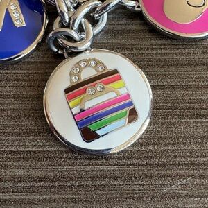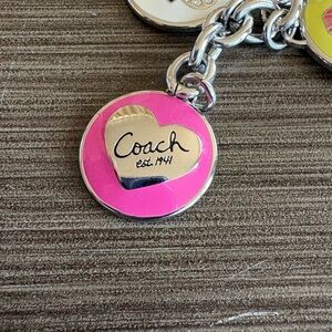 Coach silver-tone key ring with multiple enamel disc charms including legacy stripe kisslock bag, pink heart, yellow jacket, blue airplane, and additional Coach-themed discs. Split key ring attachment. Clean condition as shown. Hard to find. No longer made.