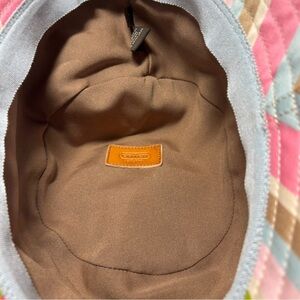 Add a splash of color to your look with this Coach bucket hat, featuring a vibrant pink and green striped design. Made from lightweight fabric, it offers a classic silhouette with a stylish strap detail, perfect for a casual, summery vibe.