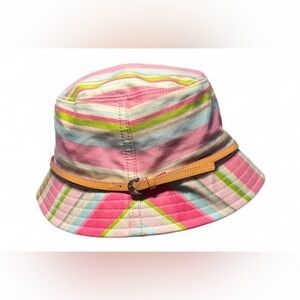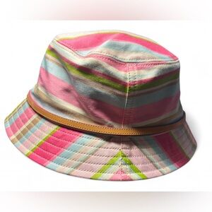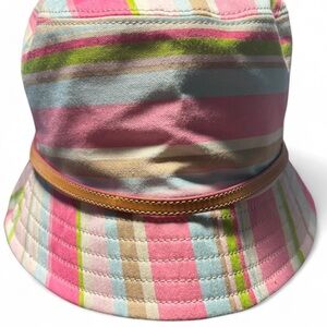 Add a splash of color to your look with this Coach bucket hat, featuring a vibrant pink and green striped design. Made from lightweight fabric, it offers a classic silhouette with a stylish strap detail, perfect for a casual, summery vibe.