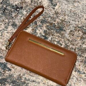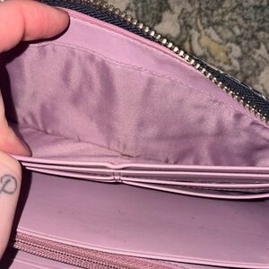 Chic wallet with vibrant circle design. Features secure zip closure. Ideal for everyday use. Not sure how to remove stain on back of wallet, inside still beautiful see pictures