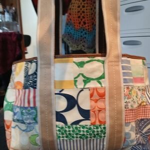 Vibrant Coach tote with a patchwork design. Features a mix of colors and patterns. Ideal for a bold fashion statement.