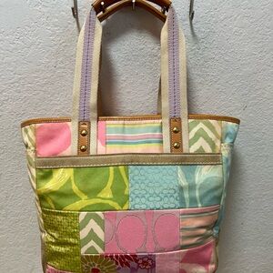Vibrant patchwork design. Bamboo handles add elegance. Perfect for any outfit.