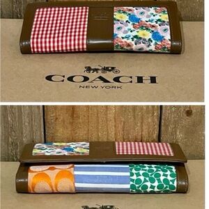Vibrant Coach wallet with floral, checkered, and geometric patterns. Stylish and unique design.