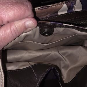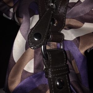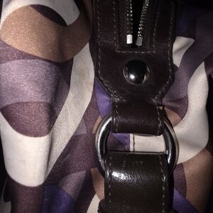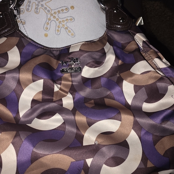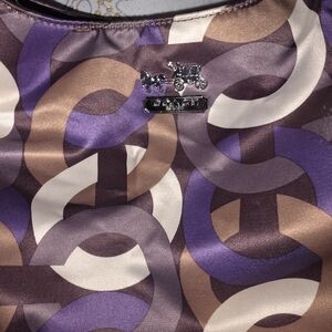 Stylish Coach handbag with a multicolor pattern. Features shades of purple, brown, and cream. Perfect for any occasion.