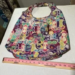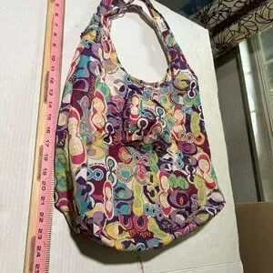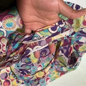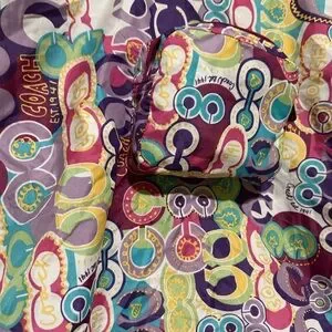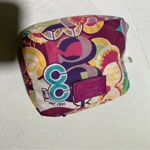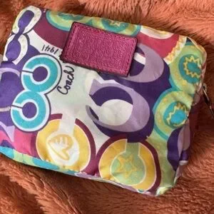 Stylish Coach pouch with a vibrant multicolor pattern. Ideal for organizing essentials.