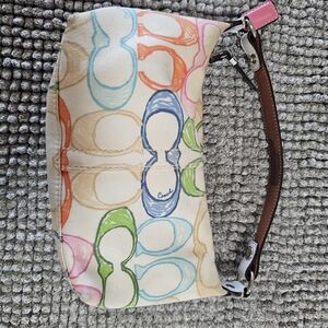 Coach Y2K shoulder bag with a playful multicolor design. Brown leather strap and silver accents.