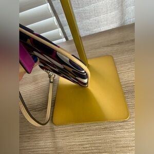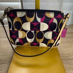 Stylish Coach wristlet with bold multicolor pattern. Features a secure zip closure and convenient wrist strap. Perfect for on-the-go use. With coach hang tag