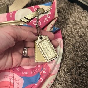 Chic Coach hobo bag with multicolor polka dots. Features a stylish design and practical zipper pocket.