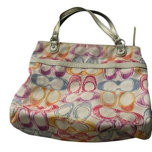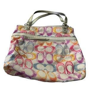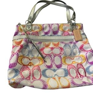 Vibrant Coach tote with playful shoe print. Features silver handles and accents. Perfect for a stylish look.