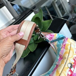Vibrant Coach hobo bag. Features signature pattern. Multicolor design with leather accents. Perfect for everyday use.