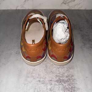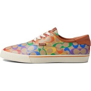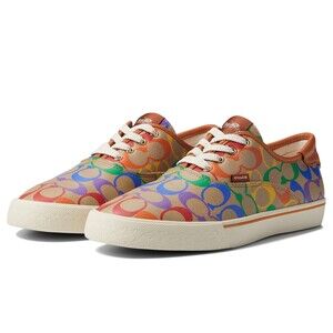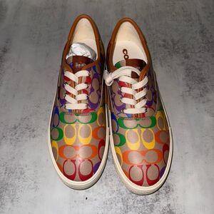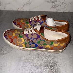 Vibrant multicolor sneakers with signature Coach pattern. Comfortable and stylish design. Perfect for casual wear.