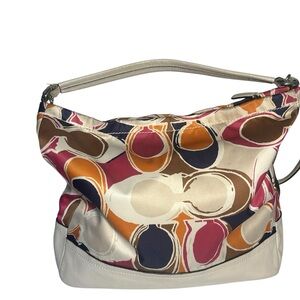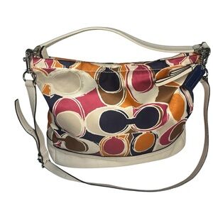 Vibrant tote with abstract pattern. Features pink, orange, navy, and cream colors. Includes adjustable strap and Coach logo.