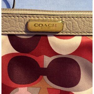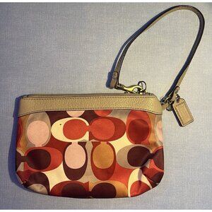 Stylish Coach wristlet with signature pattern. Features a mix of vibrant colors. Perfect for any occasion.