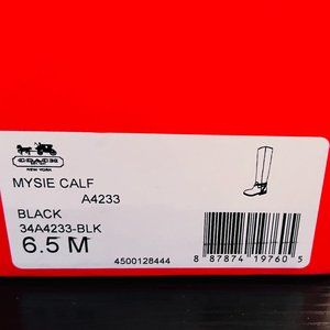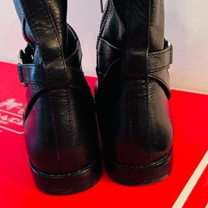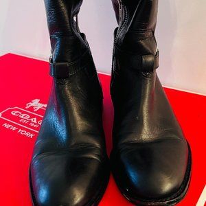 Size 6.5 Black Leather riding boot with bald middle zipper and silver Coach logo buckle design. Pre-owned has only made the leather softer and more comfortable. Some scuffs on soles but no scratches, tears or worn out areas. Lots of great wear left! Zippers work great. 15” calf. Original red Coach box included.