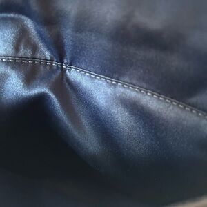 Large pop out flap pocket on front with braided leather trim and magnetic snap closure. Interior lining is navy fabric with 1 zippered pocket and 2slip pockets.