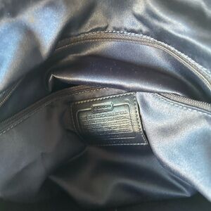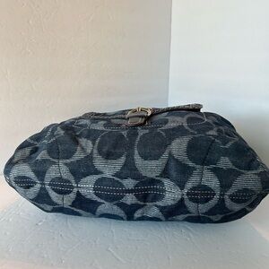 New never used Coach Poppy denim navy signature optic shoulder tote bag. Beautiful large sized Y2K tote is denim fabric with signature logo print throughout the bag. Navy leather dual shoulder handles, silver hardware,