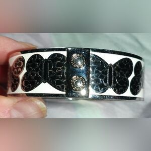 This stunning silver bracelet by Coach showcases a series of intricately designed butterflies, creating a captivating and cohesive piece. The elegant craftsmanship and unique pattern make it a standout accessory for any occasion.