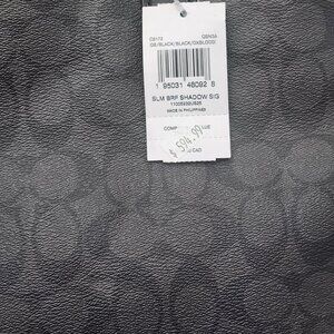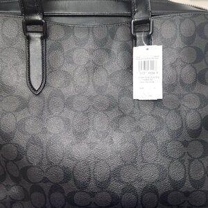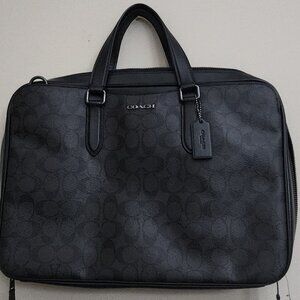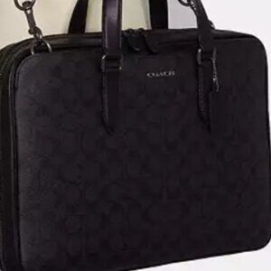 The Coach Graham Slim Briefcase in Signature Canvas is a bag made of coated canvas and calf leather. It has a zip closure, fabric lining, and measures 15.5 in x 11 in x 2.25 in.