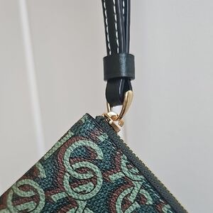 Elegant NWT Coach wristlet with intricate Coach pattern. Green and brown hues. Perfect for versatile use.