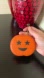 Smooth leather orange with black glitter Star eyes and big smile.