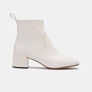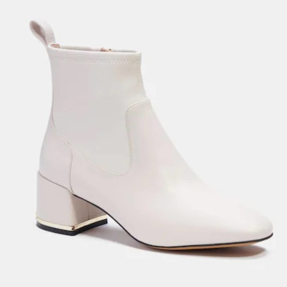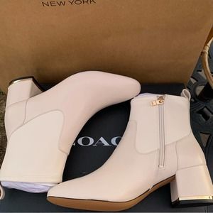 Gorgeous NEW IN BOX COACH NALA WHITE BOOTIES SIZE 8.5 Beautiful Gold Coach signature at back of heel and gold lined heel bottom. Leather and man-made leather upper Man-made leather lining and footbed Rubber outsole Zip closure Shaft: 5" height, 9 1/4" circumference 2" heel Style No. C5988 #coach #christmas #gifts #christmasgifts