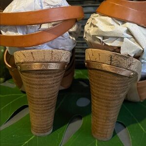 Vintage Coach shoes, made from a soft natural leather that was made become richer in color as it aged. Very comfortable on the foot. Satin gold buckle hardware, Coach logo plate on the back of heel. Lined in natural cork 4” Stacked leather heel with 1/2” cork platform. Heel has no nicks or cuts. These shoes are from the days when Coach shoes looked and felt handmade. Good condition. TTS