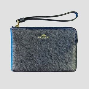 Coach Leather Corner Zip Wristlet is an everyday essential that won’t weigh you down. Crafted of navy blue crossgrian leather, this style is compact yet functional, with space for your keys, cards and phone. This small-sized wristlet features a wrist strap for ease and a zip-top closure to secure your items. To keep your cards handy on the go, organize them in the convenient built-in slots.