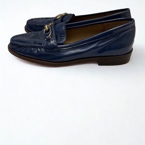 Elegant navy loafers by Coach. Features metallic detailing for a sophisticated touch.