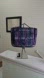 Large travel bag for toiletries by Coach. Navy blue, purple, pink plaid fabric. Double zip closure. The bag unzips from the front and the flap goes up to hang upright with the attached hook to a towel bar. There are three elasticized pockets, two clear zipper pockets, a fabric pocket, and interior storage. Great organization and storage space. Very good used condition with one mark on plastic divider as pictured. Very clean and ready for travel.